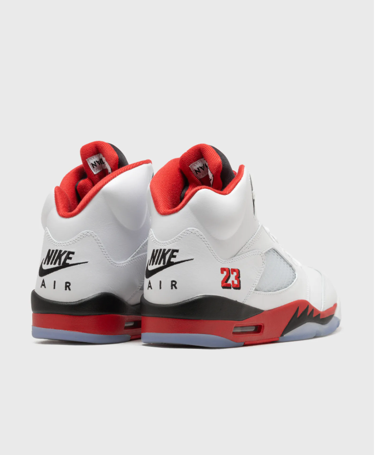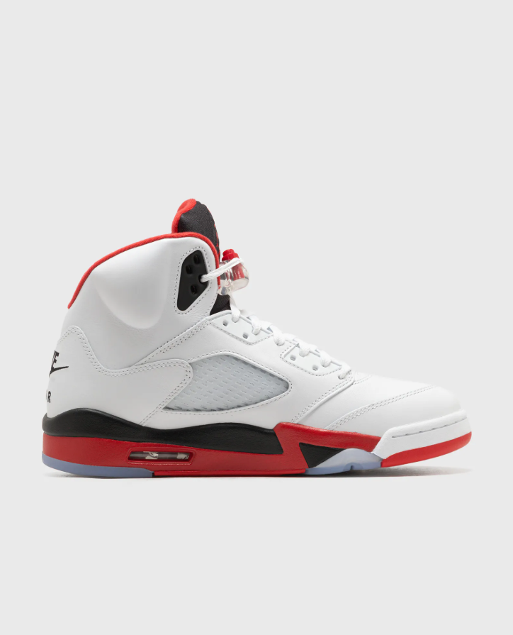 The upper combines premium leather or nubuck with breathable mesh panels for structure, comfort, and ventilation. A visible Air unit in the heel provides responsive cushioning, while the padded collar ensures a secure and supportive fit. The reflective tongue, lace lock system, and sculpted midsole give the Air Jordan 5 its distinctive look.